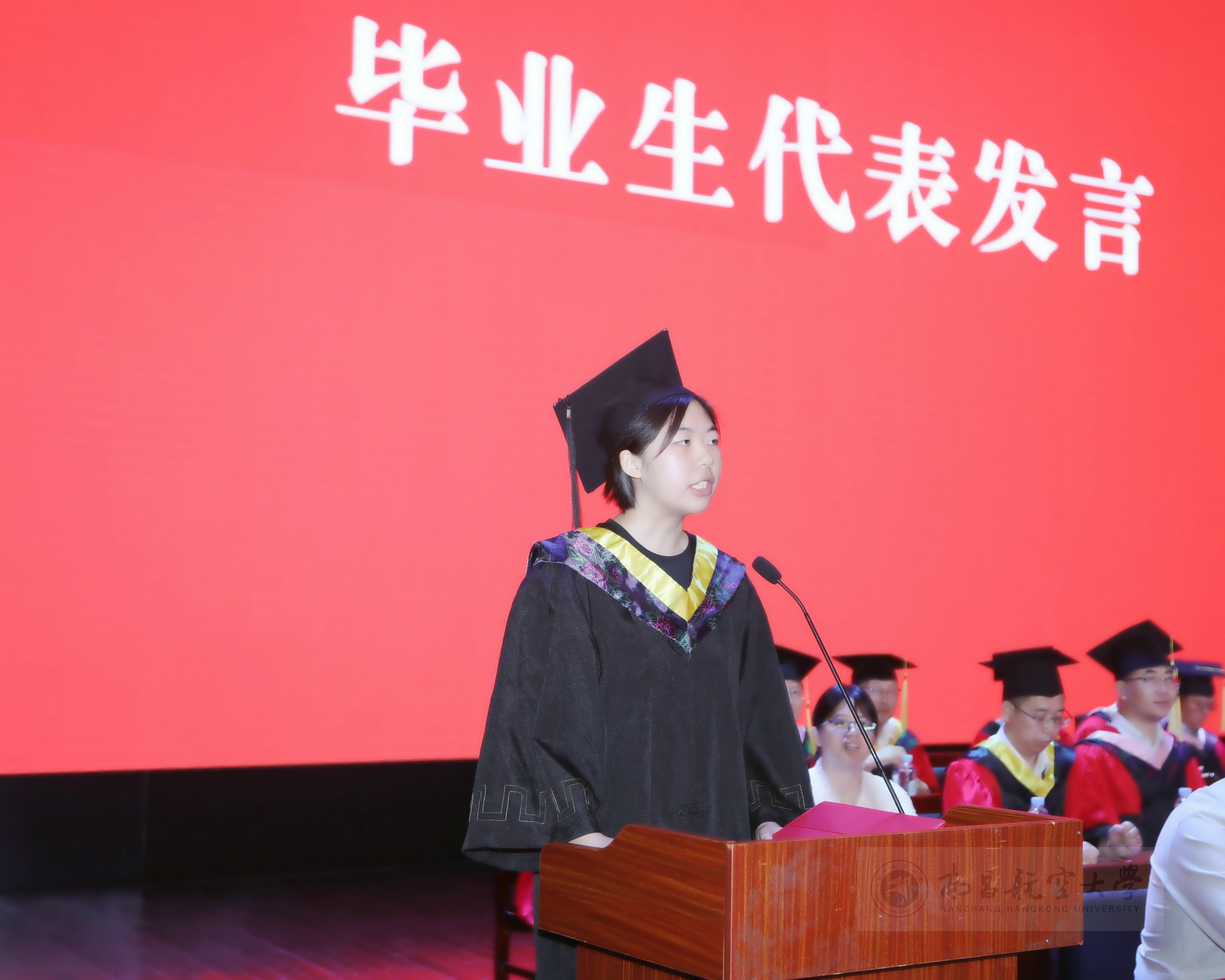 2025届本科毕业生代表、航空宇航学院210623班陈嘉煜同学深情回忆了大学四年的点点滴滴,表达了对母校衷心的感谢和崇高的敬意。她表示,将会带着“忠诚奉献、逐梦蓝天”的航空情怀、“板凳甘坐十年冷”的科研坚守和“十年磨一剑”的工匠精神,在航空强国的征程中勇毅前行,让奋斗的足迹在万里长空留下最绚丽的云彩。