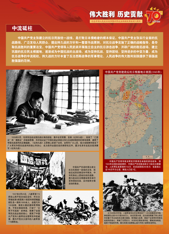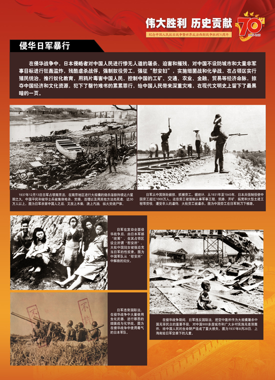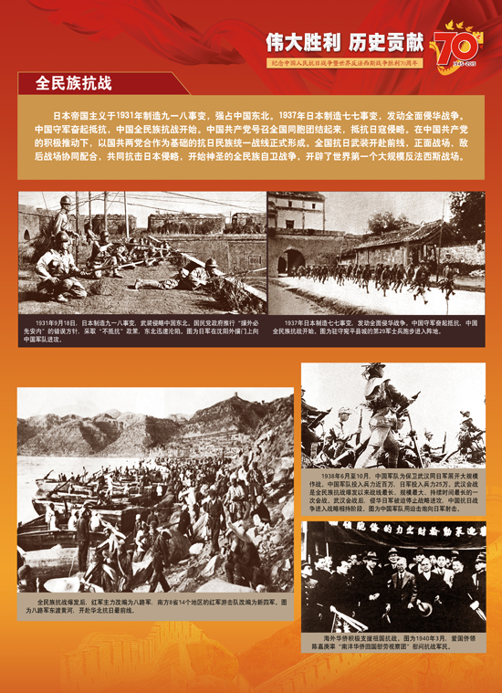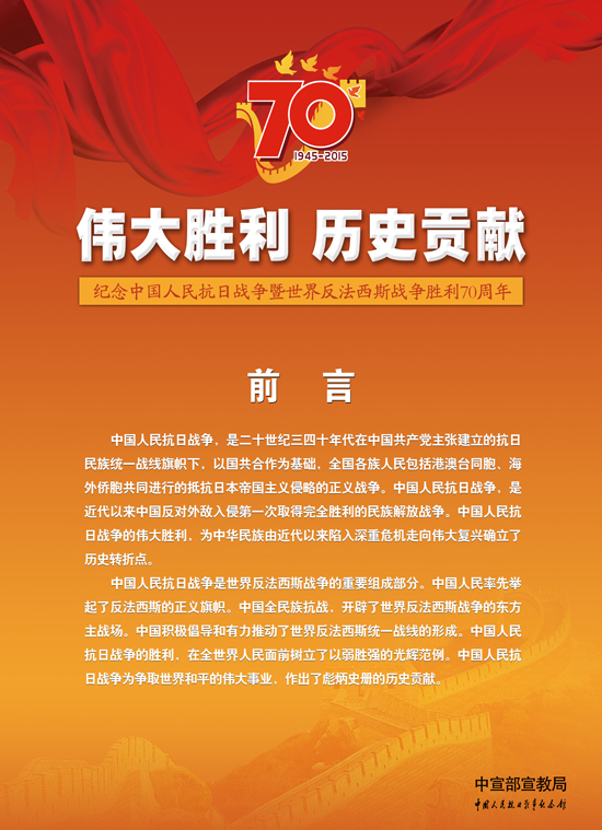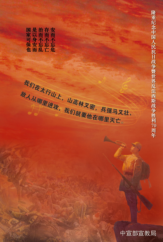 今年是中国人民抗日战争暨世界反法西斯战争胜利70周年,让我们铭记历史、缅怀先烈、珍爱和平,砥砺民族复兴的坚强信念,弘扬以爱国主义为核心的伟大民族精神,开创中华民族伟大复兴的美好未来。