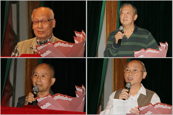 李世成、汪国钟、胡健、段运芳、廖彩星、杨春敏、彭希仁、屈大义、熊国卿等老校友 分别上台接受献花和“校友贡献奖章”