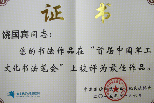 我校饶国宾老师作品在全国军工书法笔会上获奖 来源: 发布时间:2015-11-17 11:13:23 浏览次数: 次 【字体:小 大】 启航网讯 近日从中国国防科技工业文化交流协会获悉,在该协会2015年11月上旬举办的首届中国军工文化书法笔会上,我校马克思主义学院饶国宾老师的书法作品被评为最佳作品。 【打印正文】