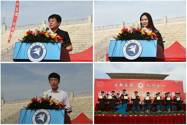 毕业生家长代表于水科、毕业生代表钟玉霞、观礼学生代表逄琛琛上台发言