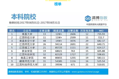 启航网讯 9月11日,江西省教育厅官方微信公众号引用“清博指数”数据,公布了江西省本科高校、高职高专院校和设区市教育局的官方微信公众号8月份(8月1日—8月31日)传播效果(WCI)排行榜。其中,南昌航空大学微信公众号传播效果在本科高校排名第三。从排名表指标数值可以看出,我校在8月份发稿量、阅读总量和点赞总量均位列全省高校之首。