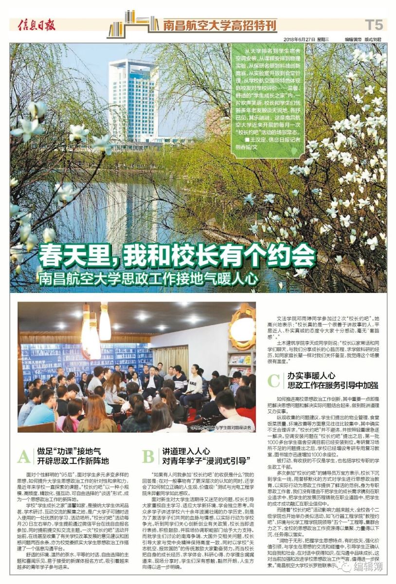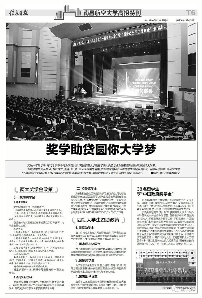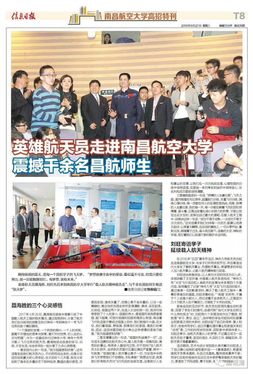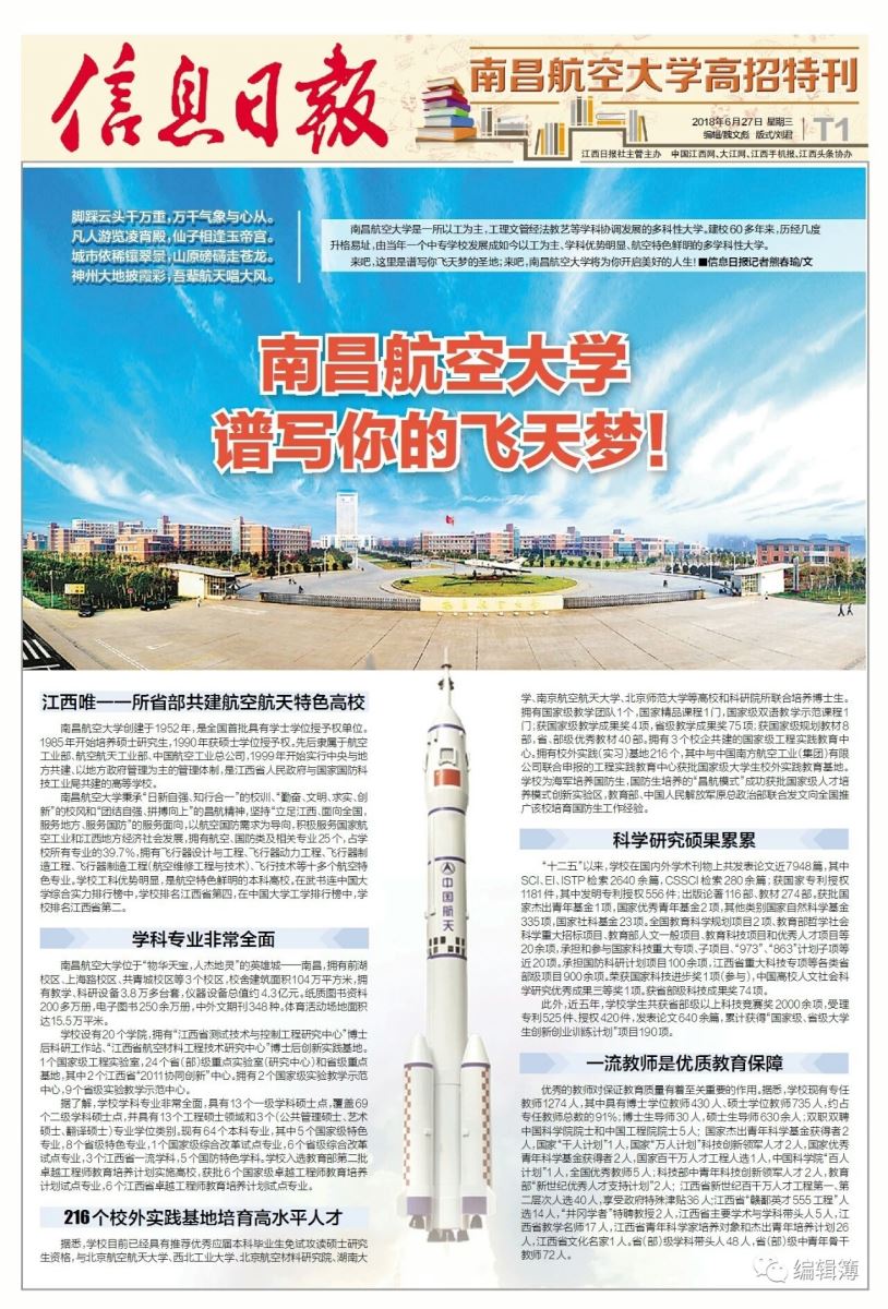 【信息日报】南昌航空大学:谱写你的飞天梦! 来源: 发布时间:2018-06-28 10:31:09 浏览次数: 次 【字体:小 大】 启航网讯 6月27日,信息日报高招特刊以《南昌航空大学:谱写你的飞天梦!》为题,介绍了我校2018年招生政策及学校概况。热忱欢迎广大学子报考南昌航空大学! 新闻链接:http://xxrb.jxnews.com.cn/system/2018/06/27/016983549.shtml 全文: 【打印正文】