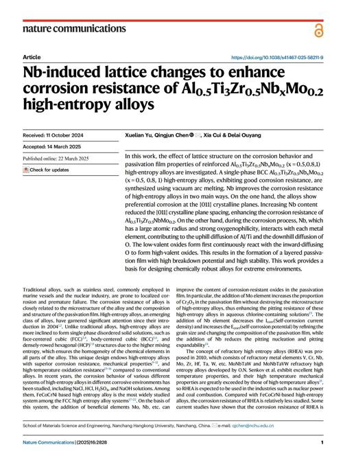 启航网讯 近日,我校材料科学与工程学院陈庆军教授团队在高熵合金腐蚀机理研究领域取得重要进展,相关成果以《Nb-induced lattice changes to enhance corrosion resistance of Al0.5Ti3Zr0.5NbxMo0.2 high-entropy alloys》为题,发表于材料领域国际顶级期刊Nature子刊《Nature Communications》(影响因子16.1)。该研究首次揭示了Nb元素对单相BCC结构的Al0.5Ti3Zr0.5NbxMo0.2高熵合金在3.5% NaCl溶液中腐蚀行为的调控机制,发现Nb通过减小{011}晶面间距和促进Al/Ti原子上坡扩散,显著提升了合金耐蚀性;同时,Nb的加入诱导形成了具有分层结构和高稳定性的钝化膜,击穿电位达8.68 VSCE,为极端环境用高耐蚀合金设计提供了新思路。