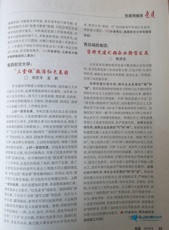 中宣部《党建》杂志以“南昌航空大学:‘三堂课’激活红色基因”为题报道我校思政教育先进经验 来源: 发布时间:2019-05-09 11:45:20 浏览次数: 次 【字体:小 大】 中宣部《党建》杂志以“南昌航空大学:‘三堂课’激活红色基因”为题报道我校思政教育先进经验 启航网讯 由中共中央宣传部主管的《党建》杂志在2019年5月月刊以“南昌航空大学:‘三堂课’激活红色基因”为题,报道我校致力于上好思政课、微党课、实践课,引导学生厚植爱国主义情怀,构建思政教育强有力抓手的先进经验和做法。 【打印正文】