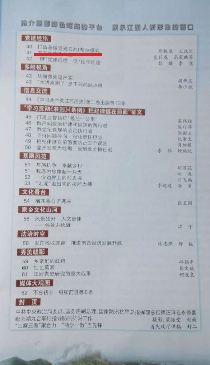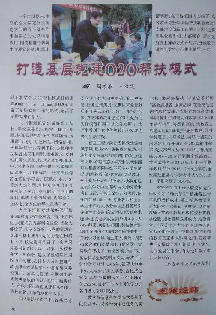 启航网讯 近日,中共江西省委机关刊、中共江西省委主管主办《当代江西》杂志2016年第7期,以《打造基层党建O2O帮扶模式》为题,报道了南昌航空大学基层党建工作。