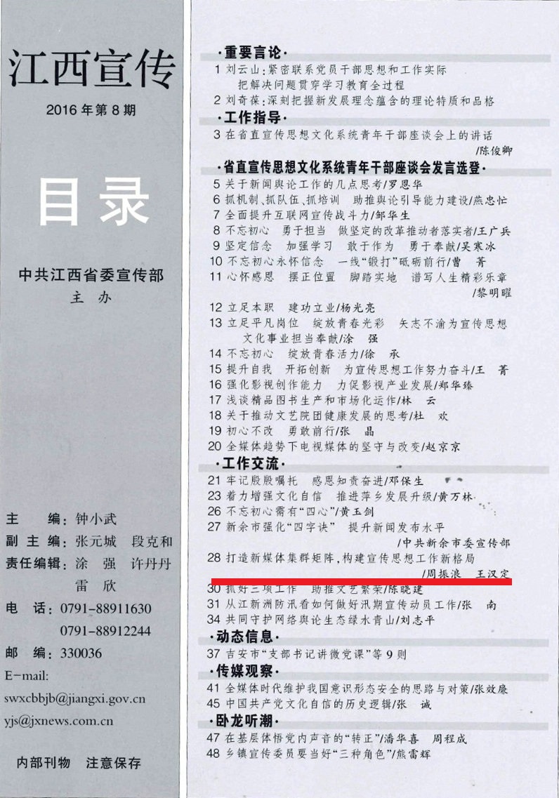 启航网讯 近日,全国优秀宣传期刊、中共江西省委宣传部主办《江西宣传》杂志2016年第8期,以《打造新媒体集群矩阵,构建宣传思想工作新格局》为题,报道了南昌航空大学宣传思想工作的做法。
