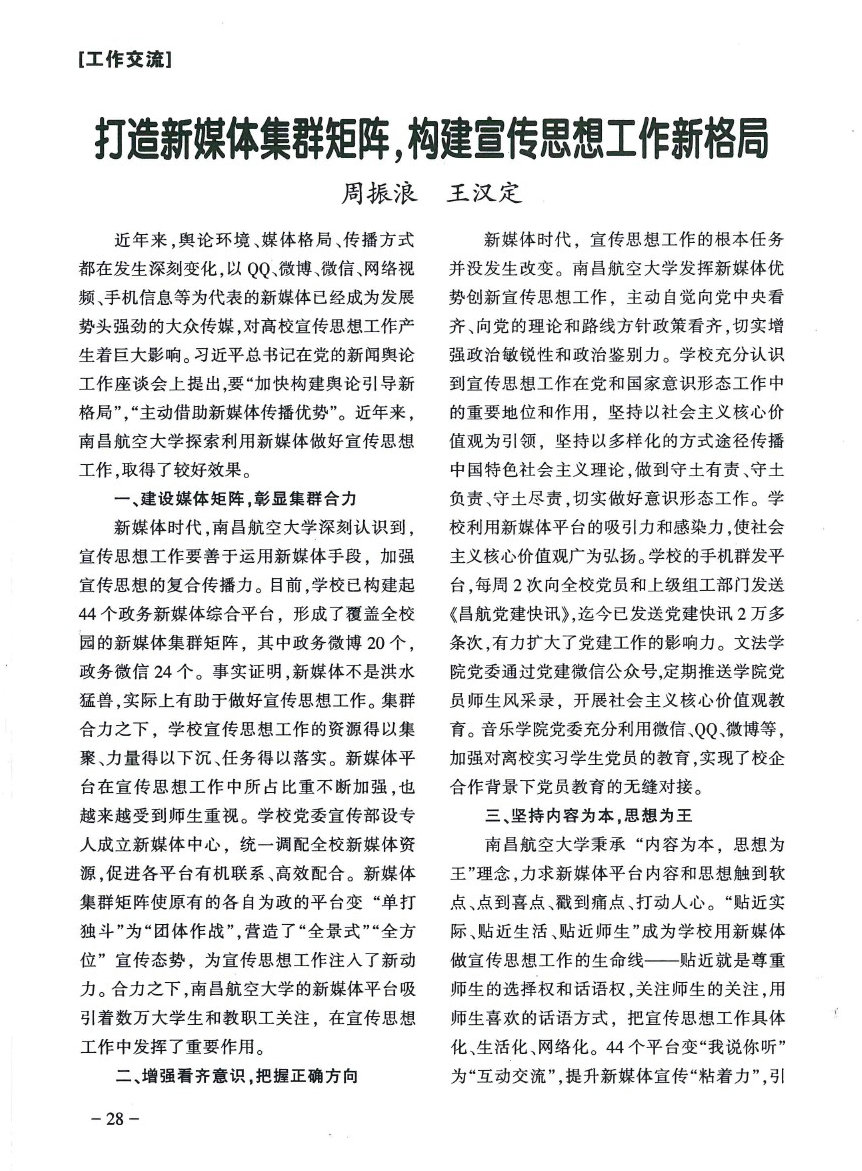 新媒体时代,南昌航空大学深刻认识到,宣传思想工作应善于运用新媒体手段,加强宣传思想的复合传播力。目前,学校已构建起44个政务新媒体综合平台,形成了覆盖全校园的新媒体集群矩阵,其中政务微博20个,政务微信24个。事实证明,新媒体不是洪水猛兽,实际上有助于做好宣传思想工作。集群合力之下,学校宣传思想工作的资源得以集聚、力量得以下沉、任务得以落实。新媒体平台在宣传思想工作中所占比重不断加强,也越来越受到师生重视。学校党委宣传部设专人成立新媒体中心,统一调配全校新媒体资源,促进各平台有机联系、高效配合。新媒体集群矩阵使原有的各自为政的平台变“单打独斗”为“团体作战”,营造了“全景式”“全方位”宣传态势,为宣传思想工作注入了新动力。合力之下,南昌航空大学的新媒体平台吸引着数万大学生和教职工关注,在宣传思想工作中发挥了重要作用。