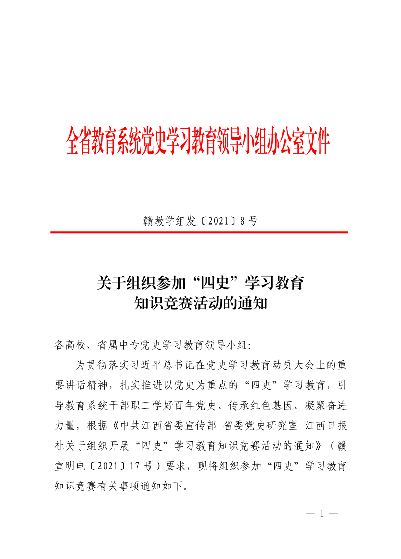为贯彻落实习近平总书记在党史学习教育动员大会上的重要讲话精神,扎实推进以党史为重点的“四史”学习教育,引导教育系统干部职工学好百年党史、传承红色基因、凝聚奋进力量,根据《中共江西省委宣传部 省委党史研究室 江西日报社关于组织开展“四史”学习教育知识竞赛活动的通知》和省委教育工委、省教育厅要求,现将组织参加“四史”学习教育知识竞赛有关事项通知如下。