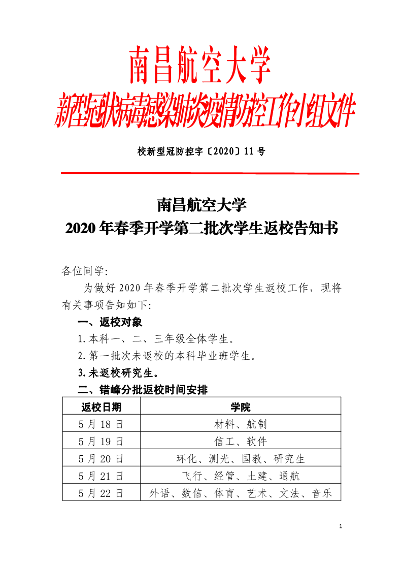 南昌航空大学2020年春季开学第二批次学生返校告知书