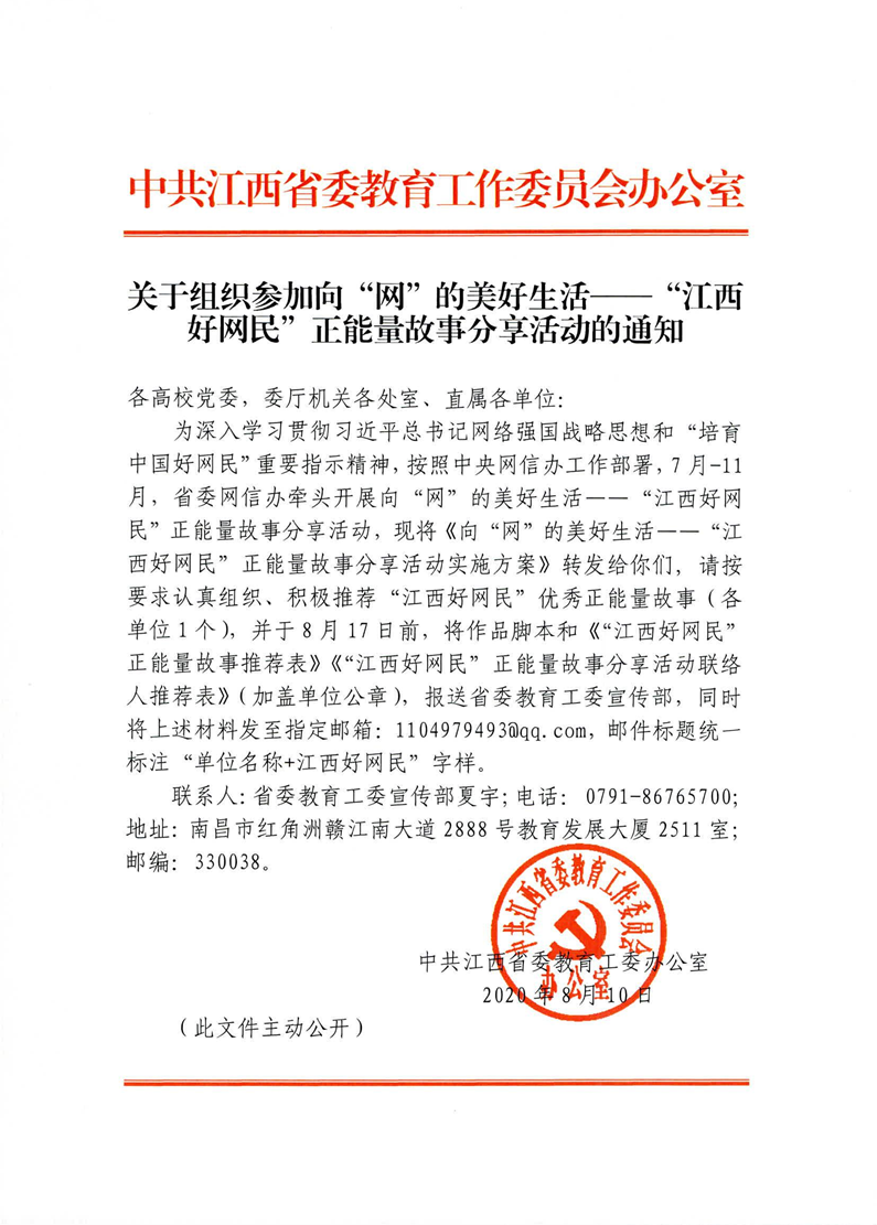 接上级文件通知,为深入学习贯彻习近平总书记网络强国战略思想和“培育中国好网民”重要指示精神,按照中央网信办工作部署,7月一11 月,省委网信办牵头开展向“网”的美好生活一一“江西好网民”正能量故事分享活动,现将《向“网”的美好生活一一“江西好网民”正能量故事分享活动实施方案》转发给你们,请各单位(部门)按要求认真组织、积极推荐“江西好网民”优秀正能量故事,并于8月15日前,将作品脚本和《“江西好网民” 正能量故事推荐表》《“江西好网民”正能量故事分享活动联络人推荐表报送党委宣传部,同时将上述材料发至指定邮箱:270199004@qq. com。请各申报人员,务必详细查看附件通知与相关要求,届时由学校统一择优向省委教育工委报送。