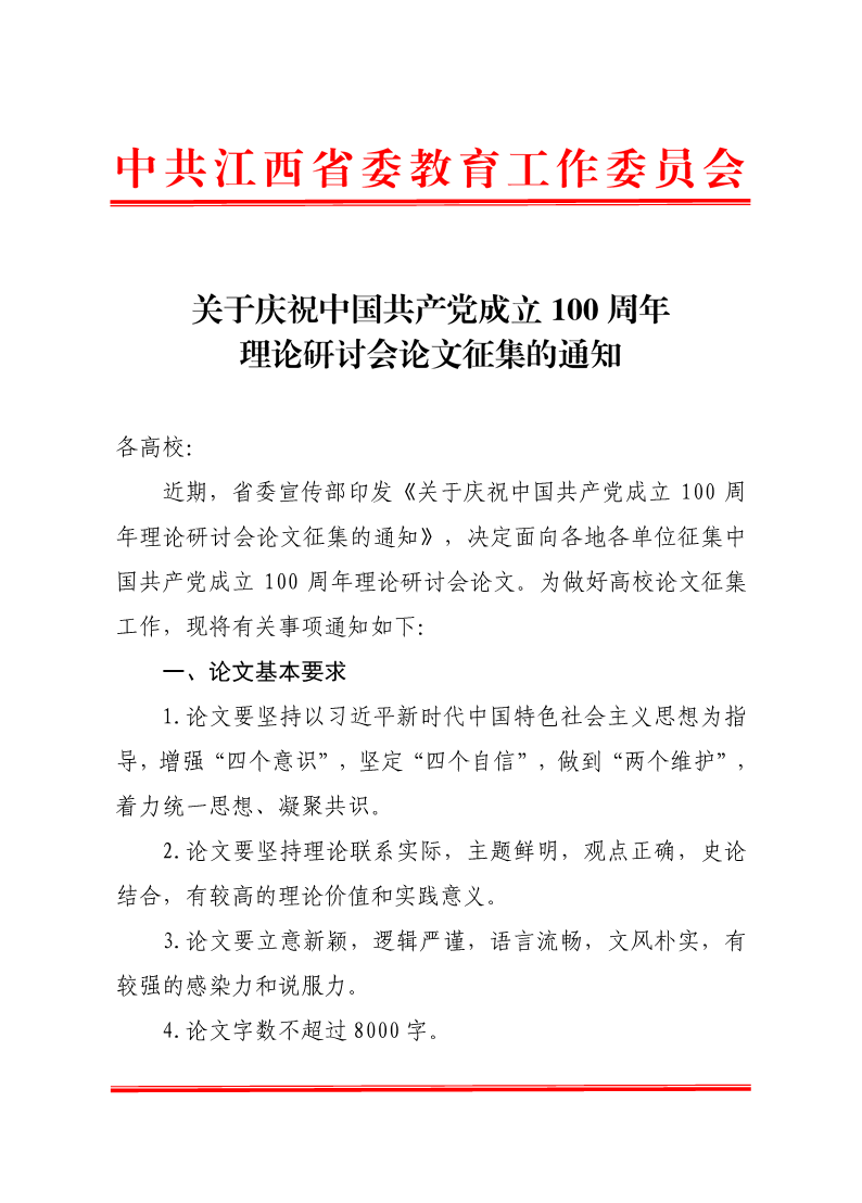 LY594关于庆祝中国共产党成立100周年理论研讨会论文征集的通知 来源: 发布时间:2021-01-06 16:29:29 浏览次数: 次 【字体:小 大】 各单位: 近期,省委宣传部印发《关于庆祝中国共产党成立 100 周年理论研讨会论文征集的通知》,决定面向各地各单位征集中国共产党成立 100 周年理论研讨会论文,为做好此项工作,请教职工踊跃参加征文活动,按照文件要求的格式拟好稿件,并于14日下午下班前发送电子版到宣传部余海办公系统。党委宣传部2021.1.6 【打印正文】