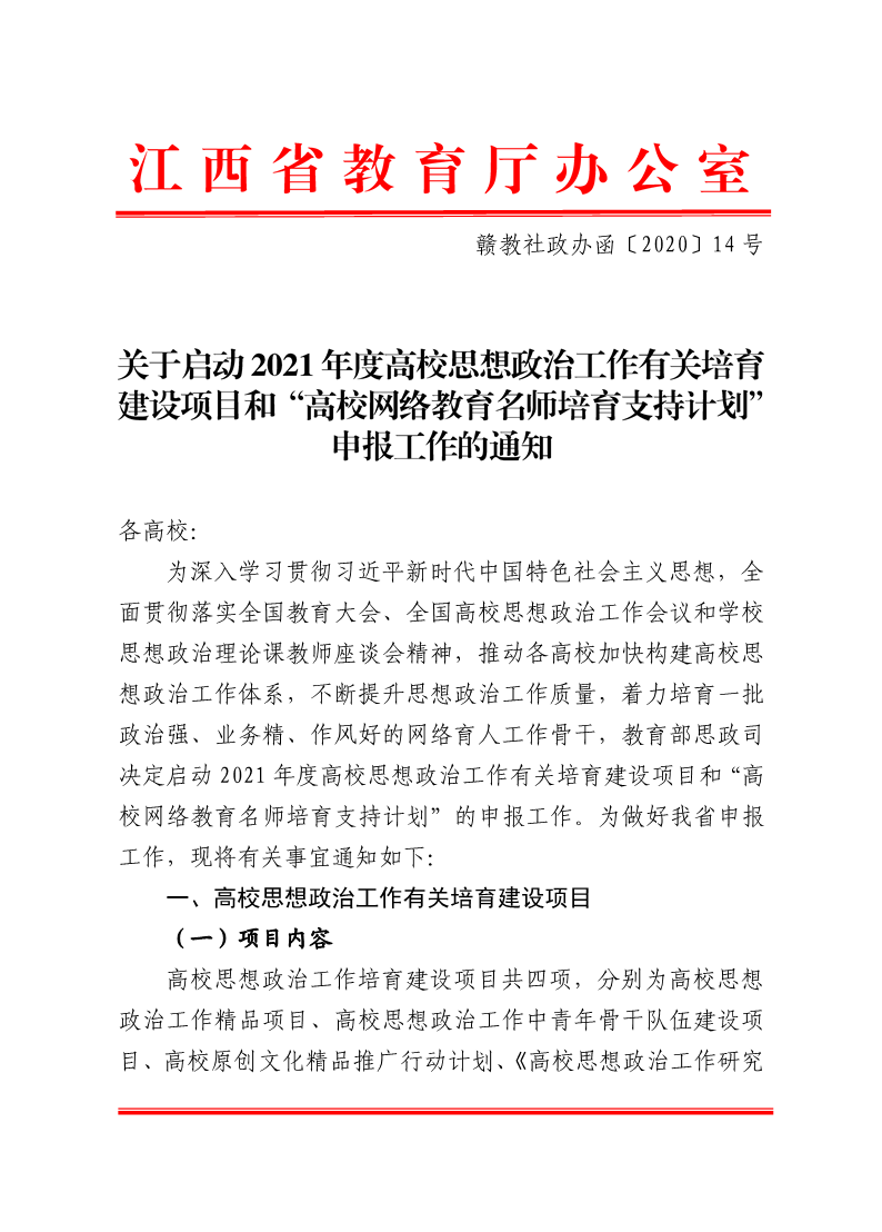 关于启动2021年度高校思想政治工作有关培育建设项目和“高校网络教育名师培育支持计划”申报工作的通知 来源: 发布时间:2020-11-08 10:56:54 浏览次数: 次 【字体:小 大】 【打印正文】
