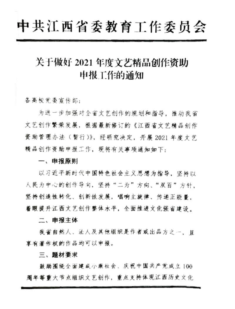 关于做好2021年度文艺精品创作资助申报工作的通知 来源: 发布时间:2021-01-29 16:10:50 浏览次数: 次 【字体:小 大】 各单位(部门): 2021年度全省文艺精品创作资助申报工作启动,按具体要求,申报种类为戏剧、电视剧、广播剧、歌曲,请有意向申报教师认真查看附件通知要求,按要求提供材料积极申报,本次申报截止时间为2021年5月1日。 【打印正文】