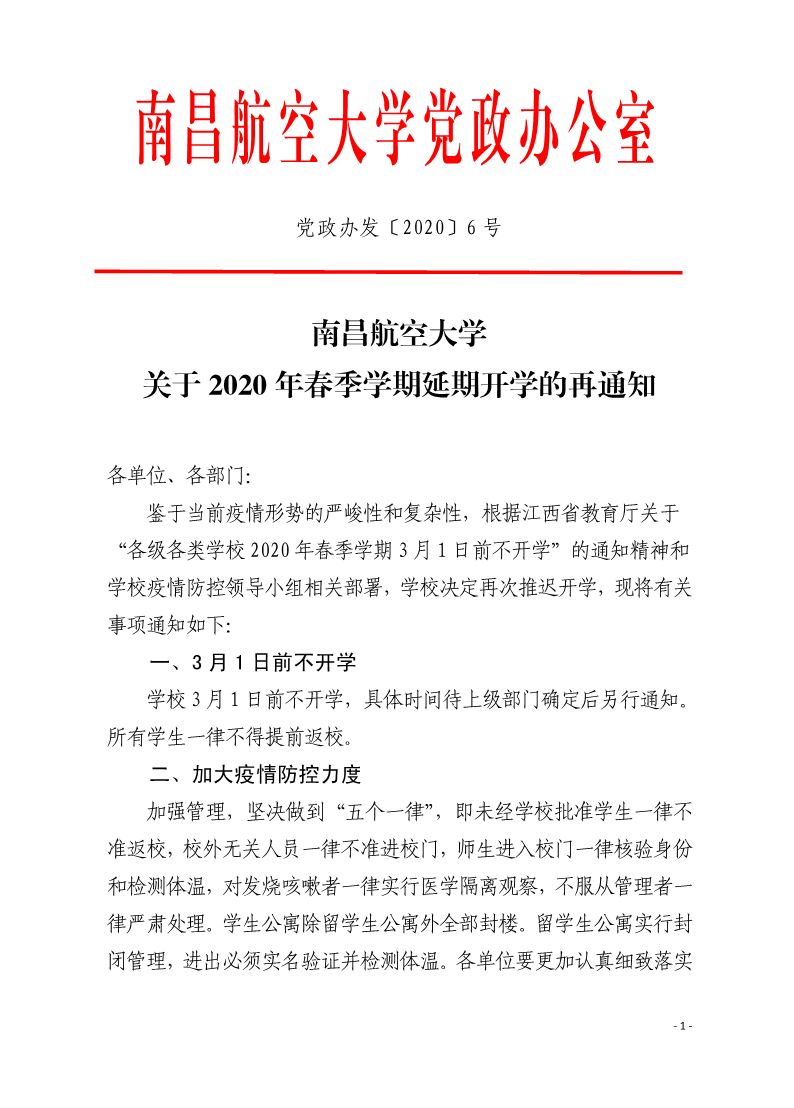【疫情防控120】南昌航空大学关于2020年春季学期延期开学的再通知